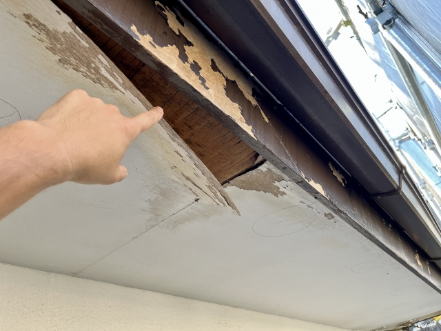 屋根の軒先にある軒天(のきてん)と呼ばれる部分に黒ずみや水染みがある場合、それは屋根や外壁からの水が内部に侵入している明らかなサインです。