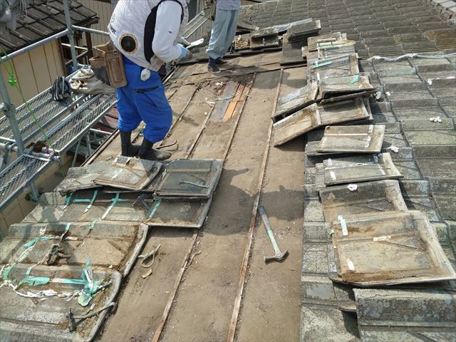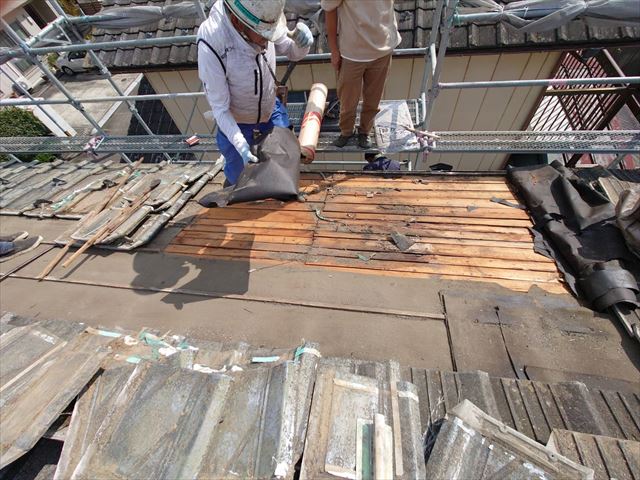 そこで、既存の瓦屋根材を撤去し、下地材の補修と防水シートの設置を行いました。